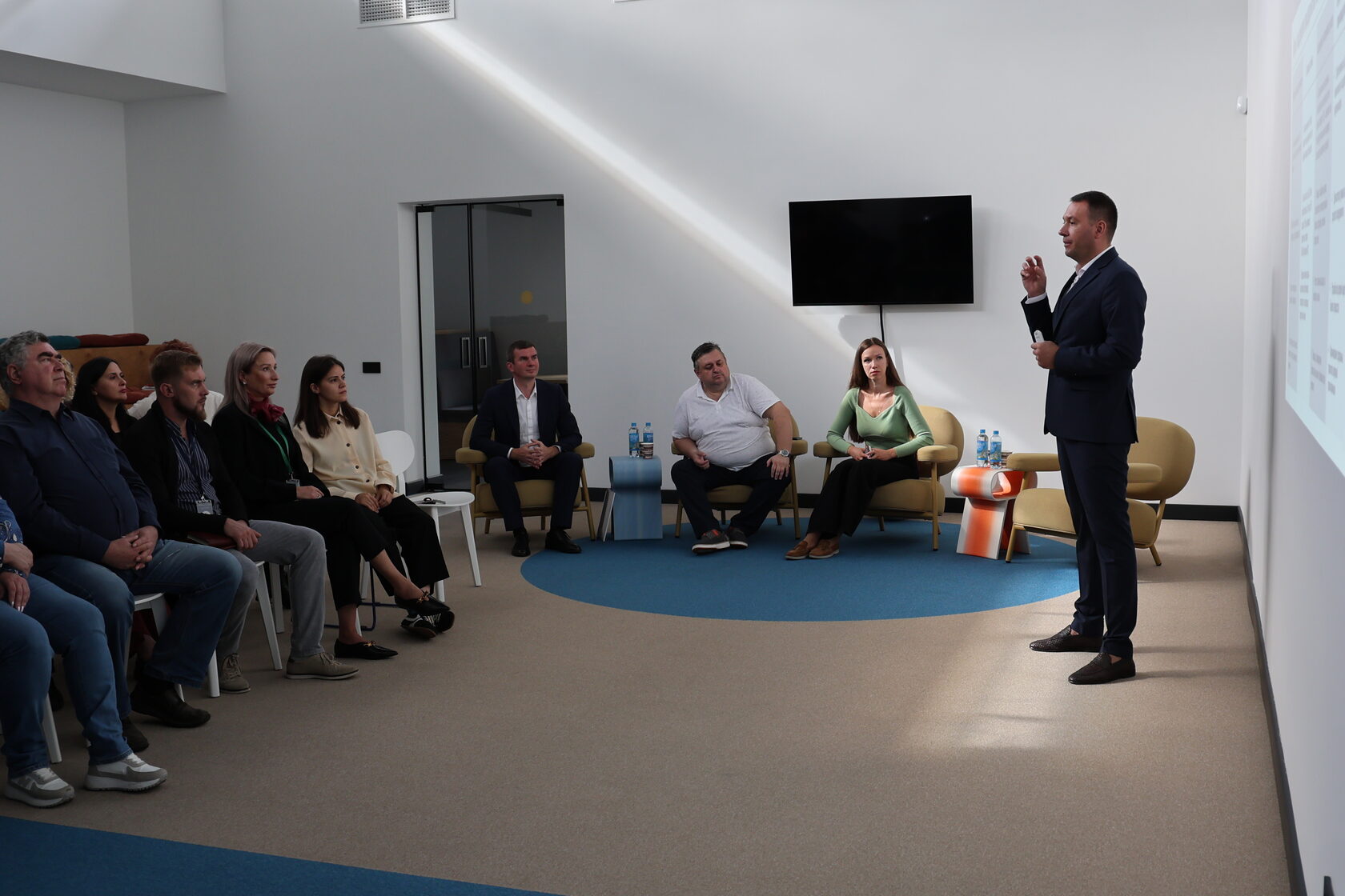 Старт проекту был дан в офисе управляющей компании. О значении и преимуществах программы для санаторно-курортной отрасли рассказали заместитель министра курортов и туризма Республики Крым Сергей Гулюк, заместитель министра экономического развития Республики Крым Олег Чибеляев, заместитель директора Фонда поддержки предпринимательства Ирина Цыпук, а также руководитель Регионального центра компетенций Крыма Роман Леонтьев и эксперты центра, которые и проведут обучение команд, Денис Михалков и Анна Белова.